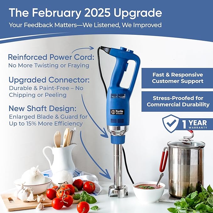 The Tartle Heavy Duty 500W Immersion Blender—available in 12", 16", 18", and 20" shaft lengths—offers precision, safety, and reliability in one compact tool. Backed by a 12-month warranty, it’s the trusted choice for chefs who need consistent results, whether blending small batches or tackling deeper containers.